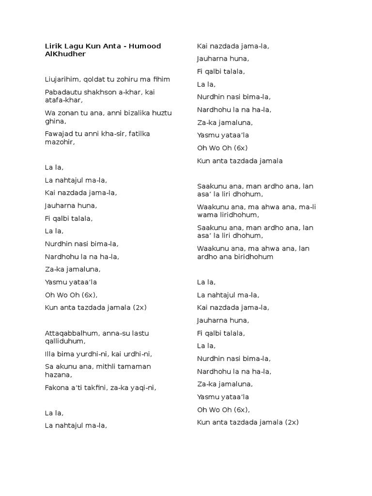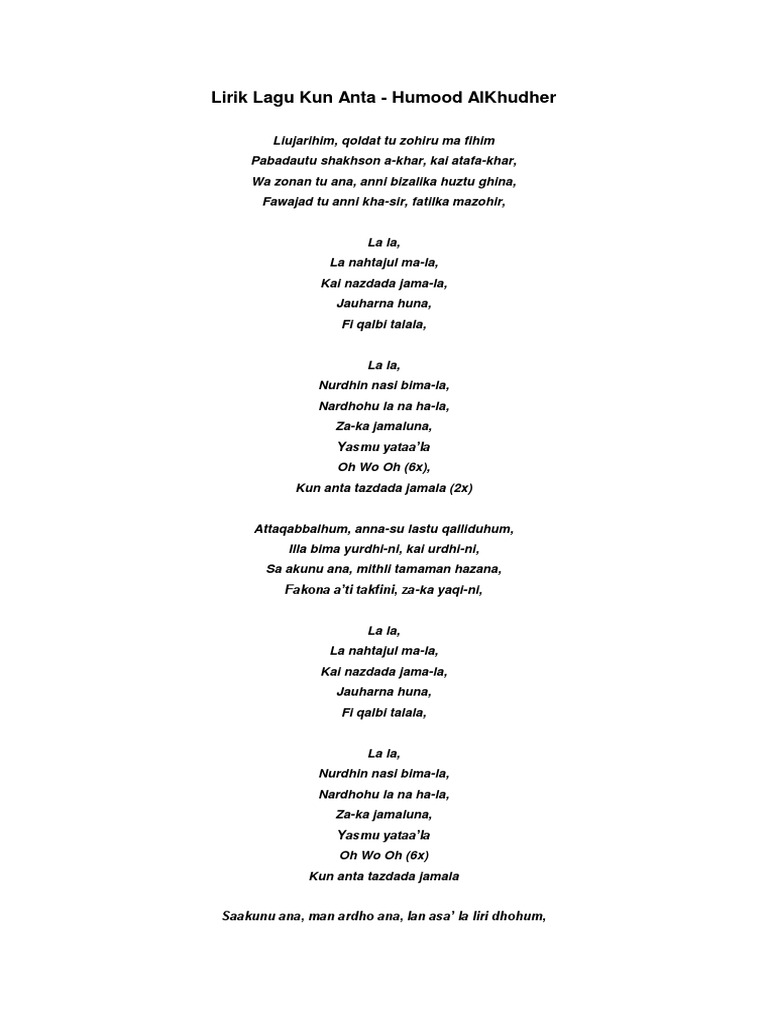 Doc Lirik Lagu Kun Anta Humood Alkhudher Dan Terjemahannya Dung Abdul Academia Edu