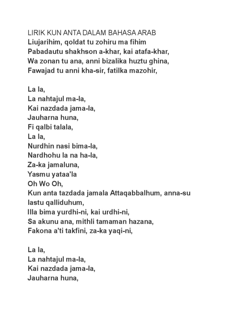 Lirik Kun Anta Dalam Bahasa Arab Pdf